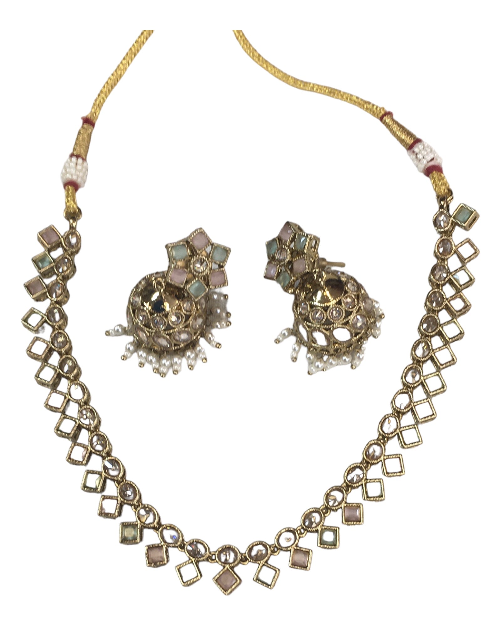 Mint / Pink - Small - Antique Gold Finish Necklace Set with Earrings - AE2405 C 0724
