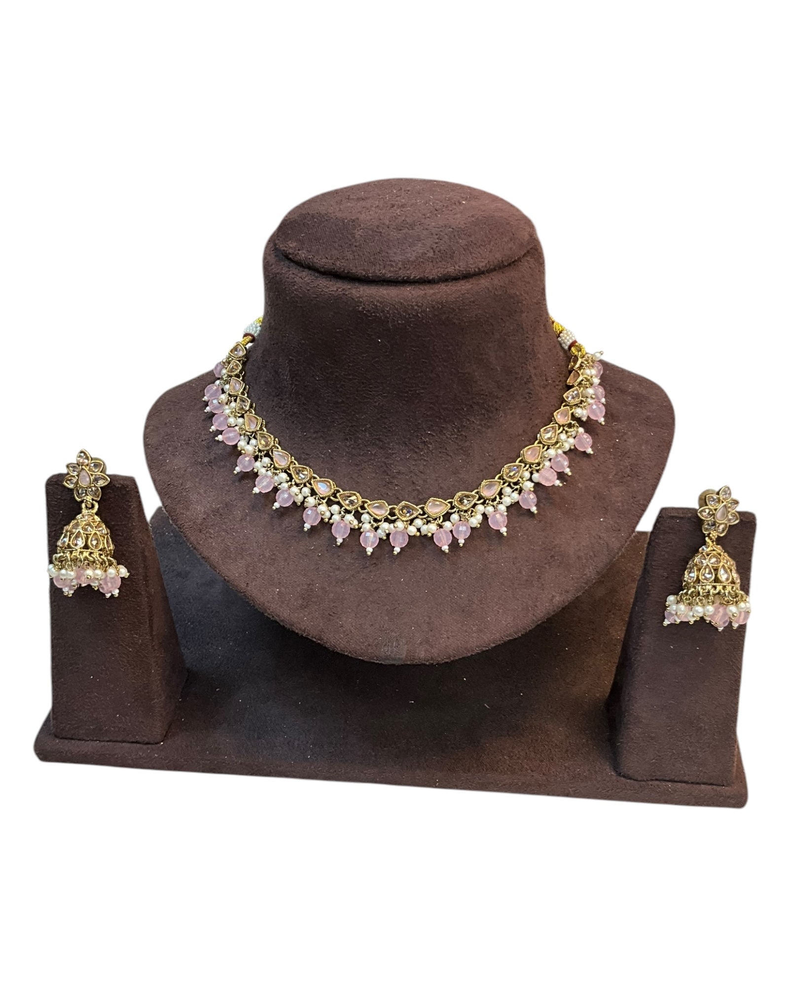 Pink - Medium Size Antique Gold Finish Necklace Set with Earrings - RAK375 Pp