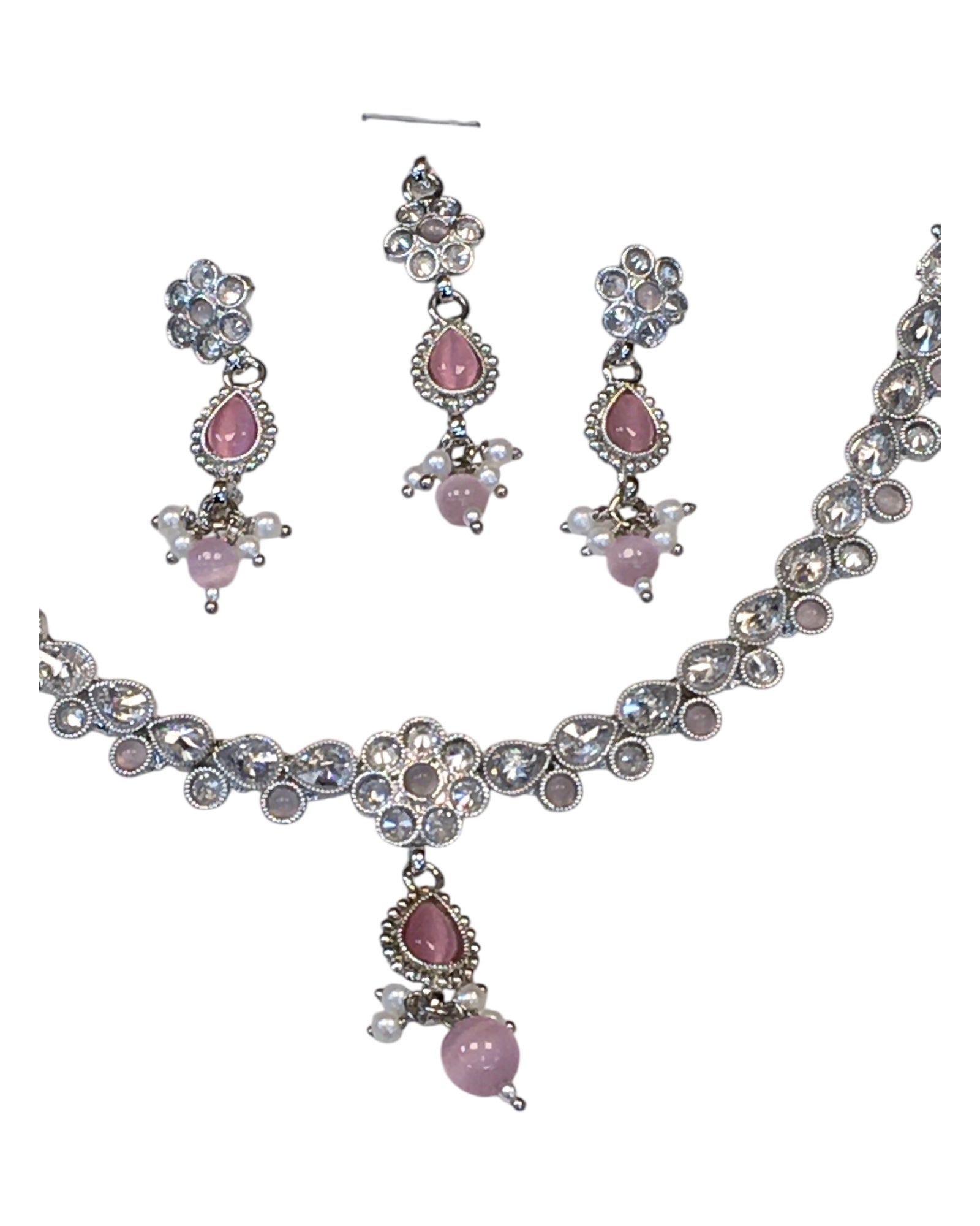 Pink - Small Size Silver Finish Necklace Set with Earrings & Head Piece /Tika- SLV78  11Ap24